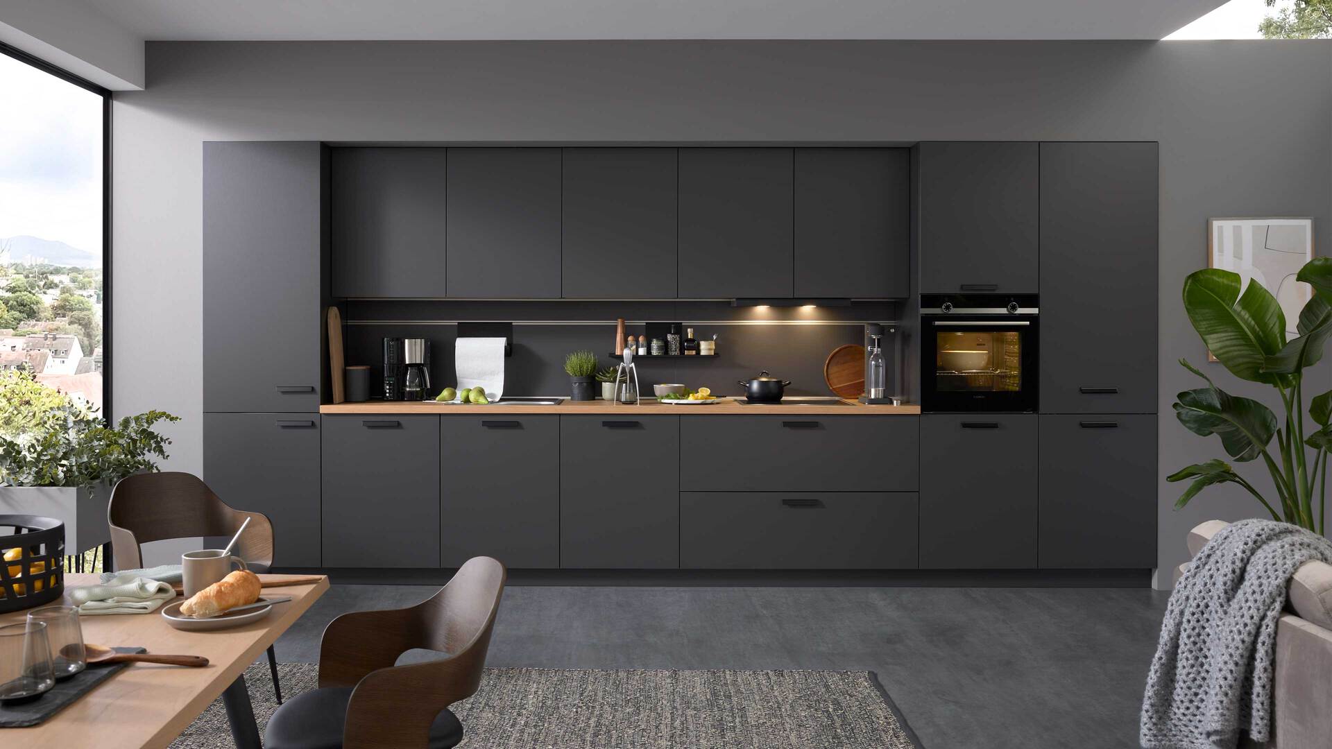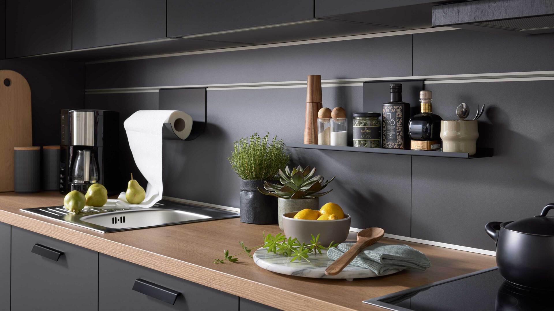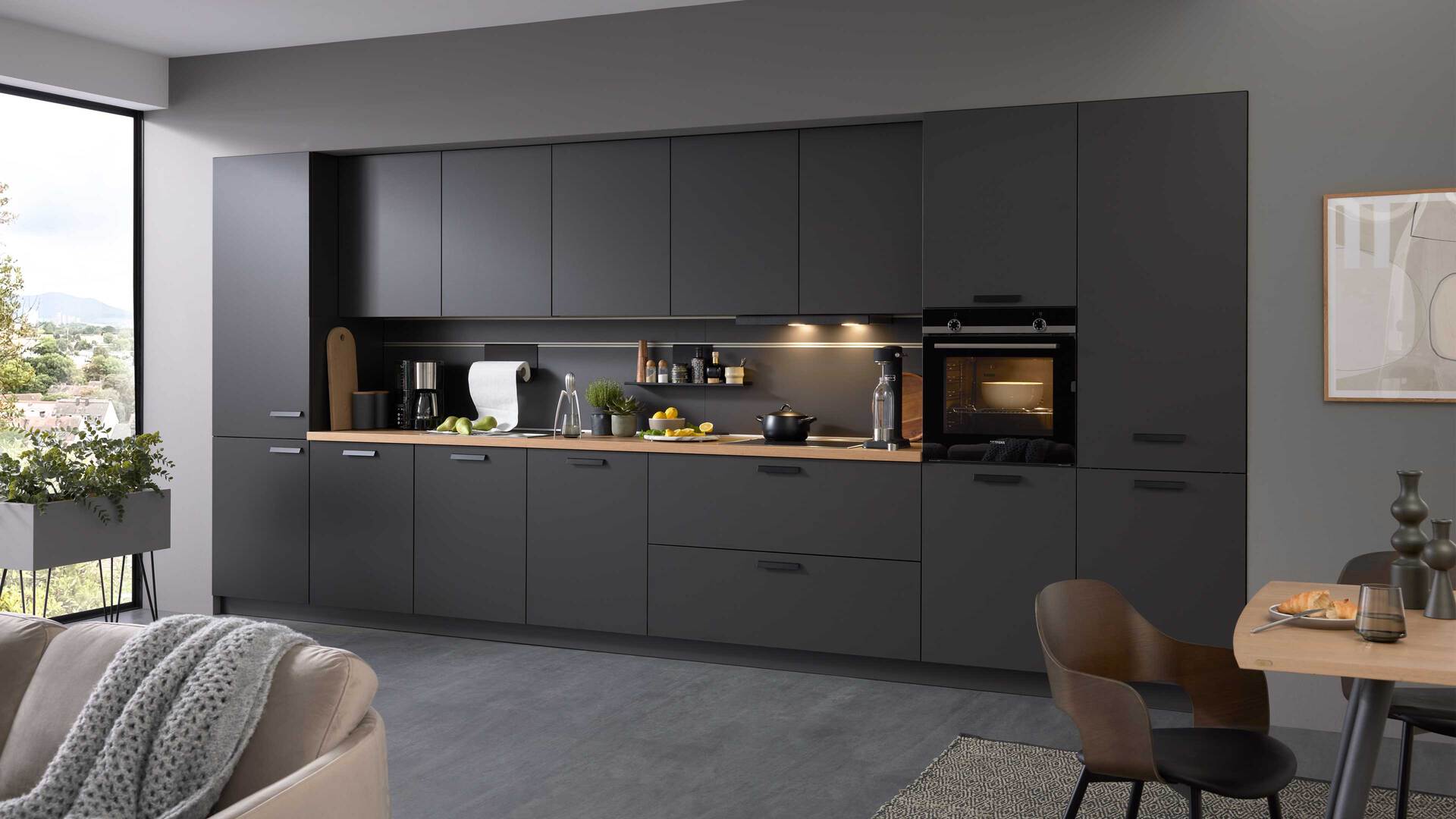 softmattes Lavaschwarz mit onyxschwarzen Griffen und Arbeitsplatte in Eiche Aurora-Nachbildung