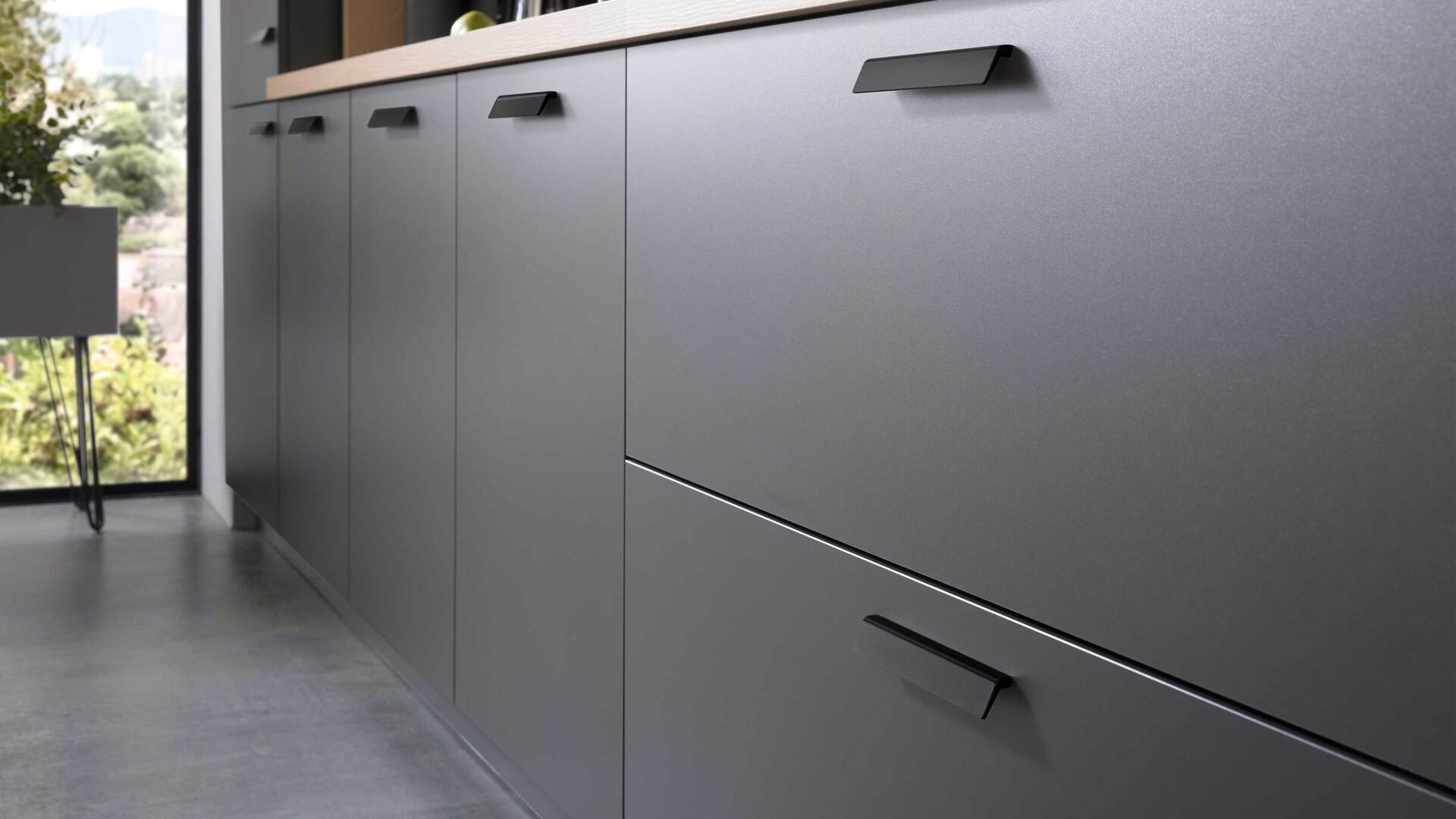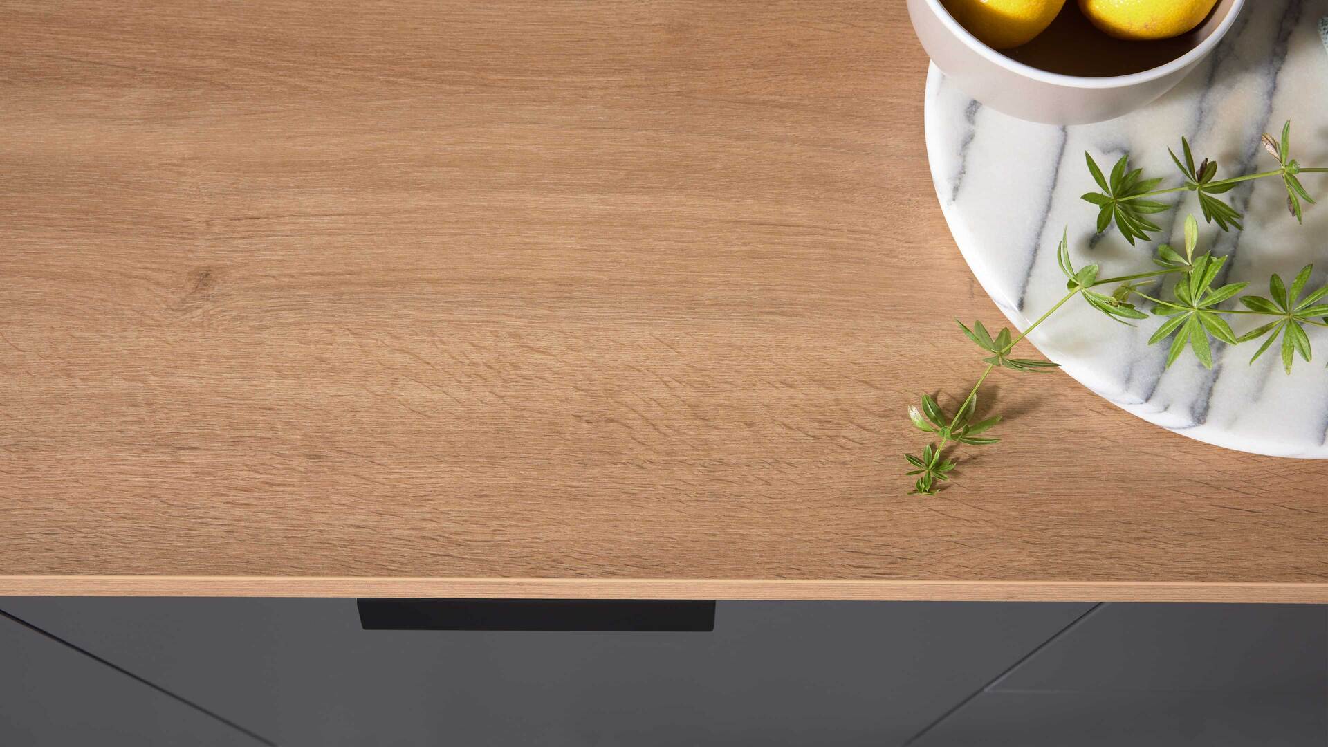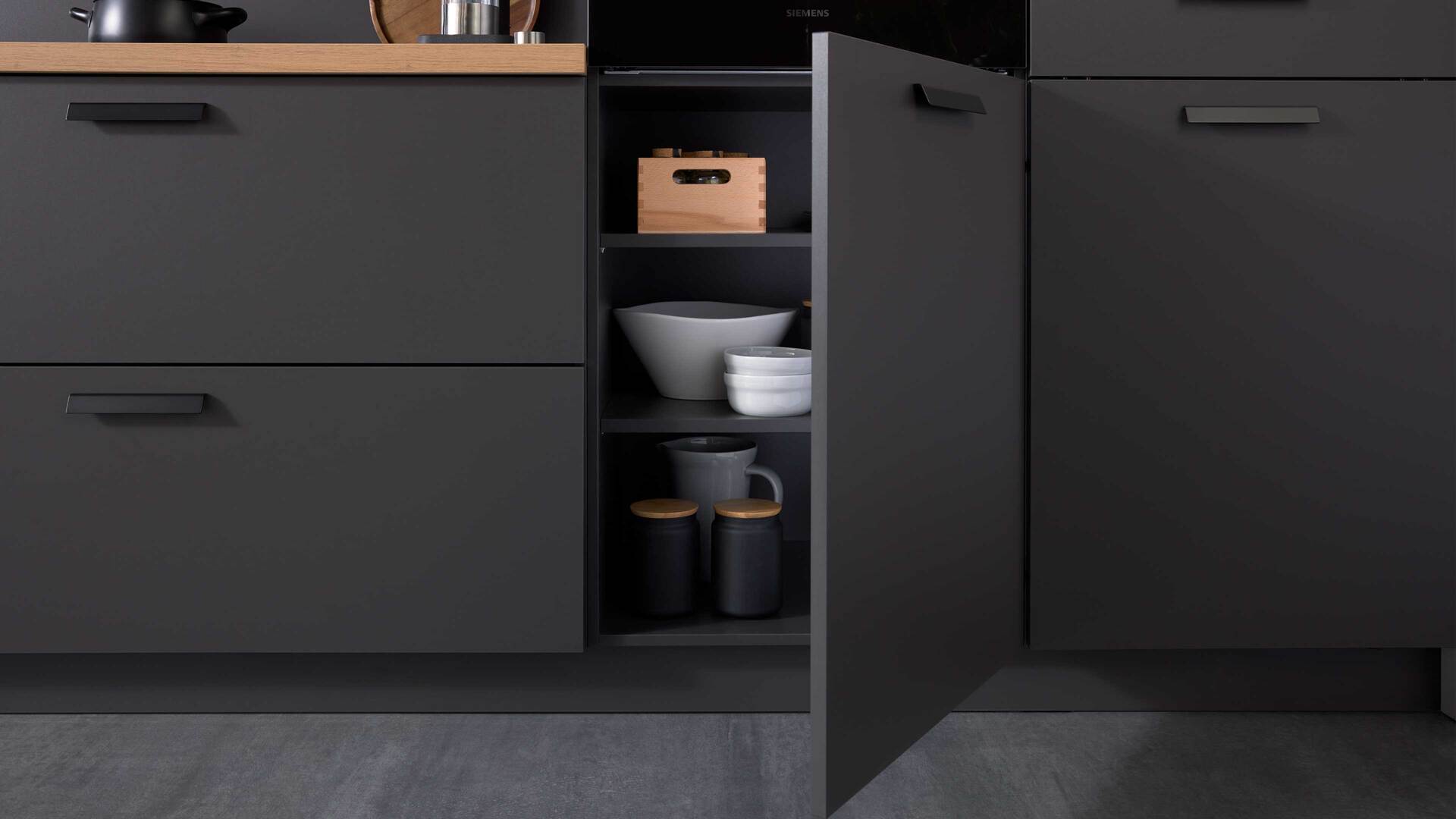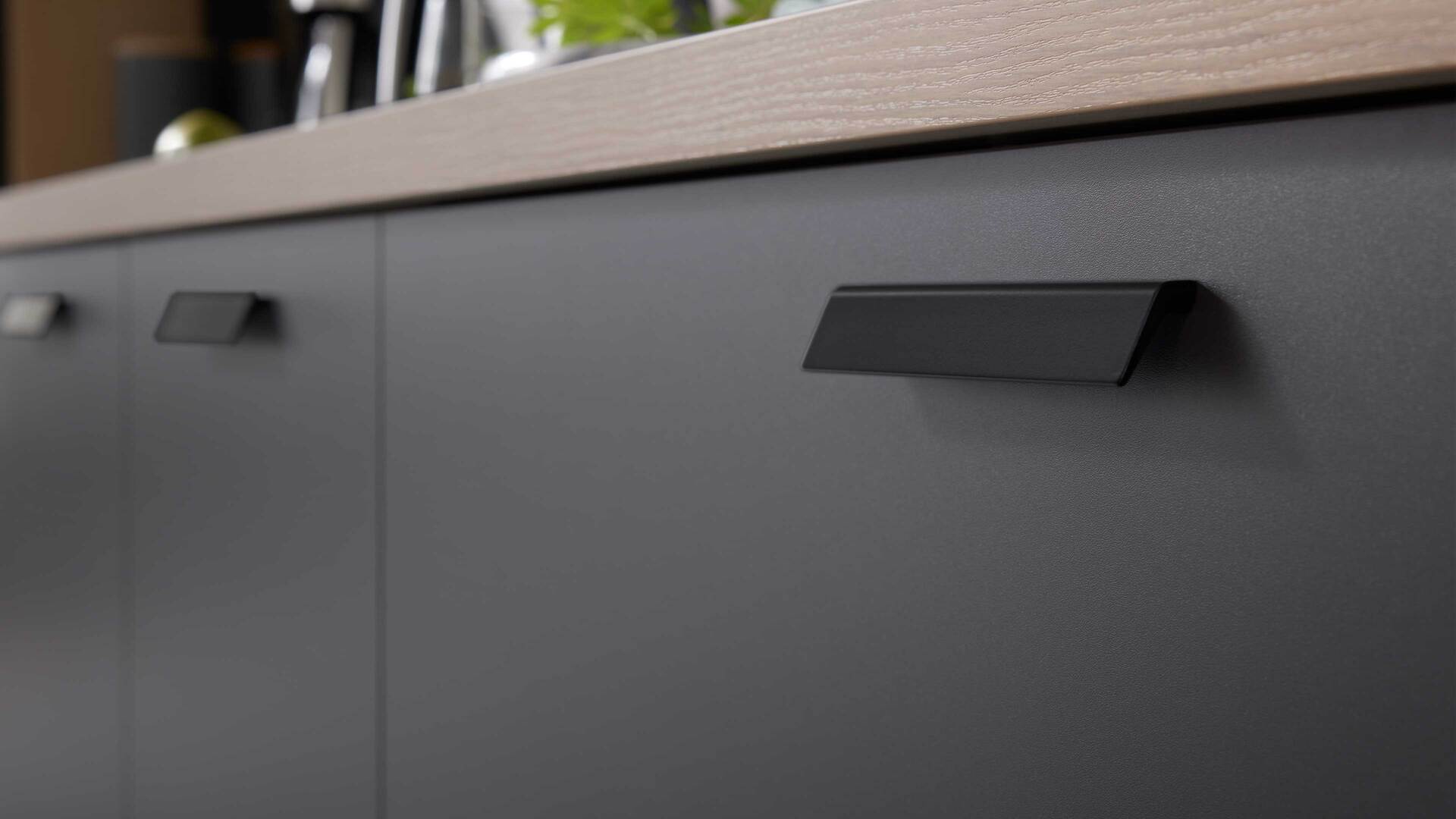 softmattes Lavaschwarz mit onyxschwarzen Griffen und Arbeitsplatte in Eiche Aurora-Nachbildung